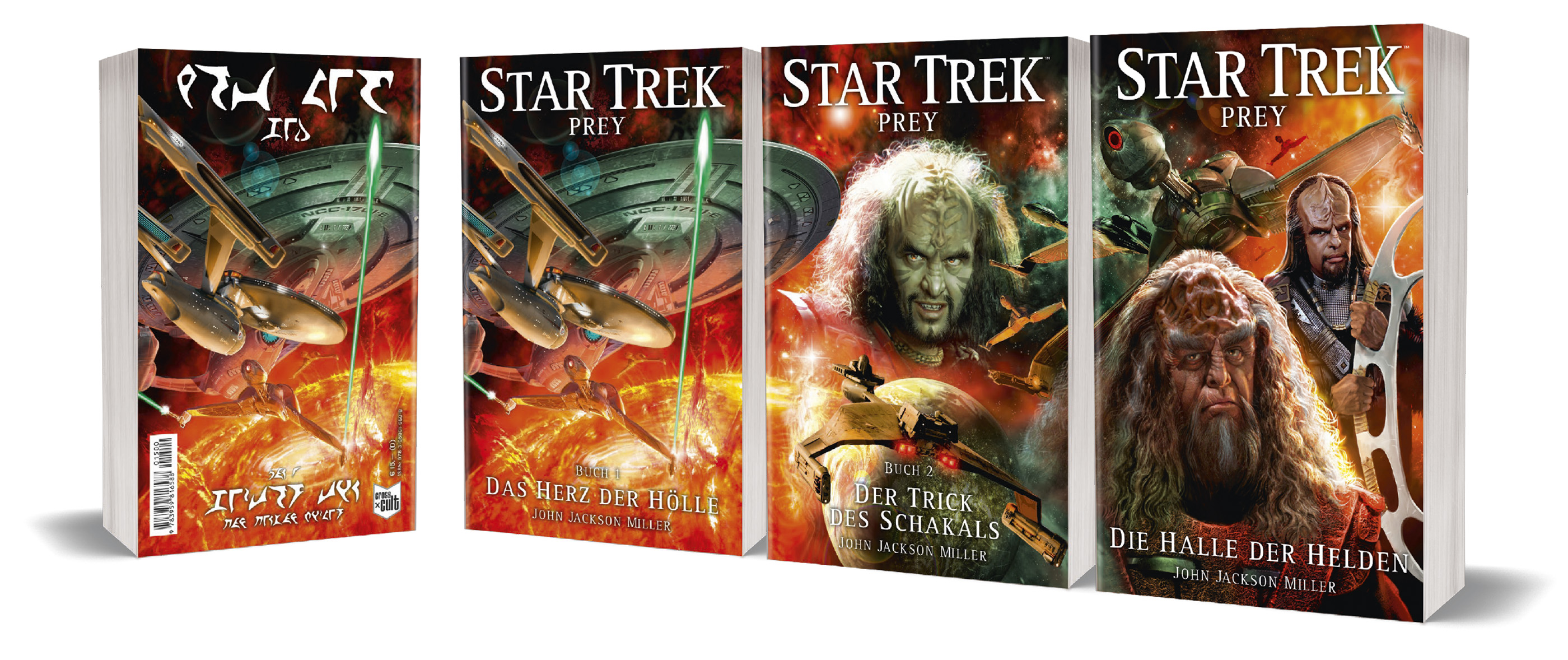 John Jackson Millers PREY-Trilogie ist das Star Trek Romanevent des Sommers. Die drei Bücher von Cross Cult erscheinen im Juli, August und September und haben als spezielle Gimmicks „klingonische Backcover“. Das Covertryptichon wurde von Martin Frei gestaltet – dem regulären Star Trek Illustrator bei Cross Cult.
