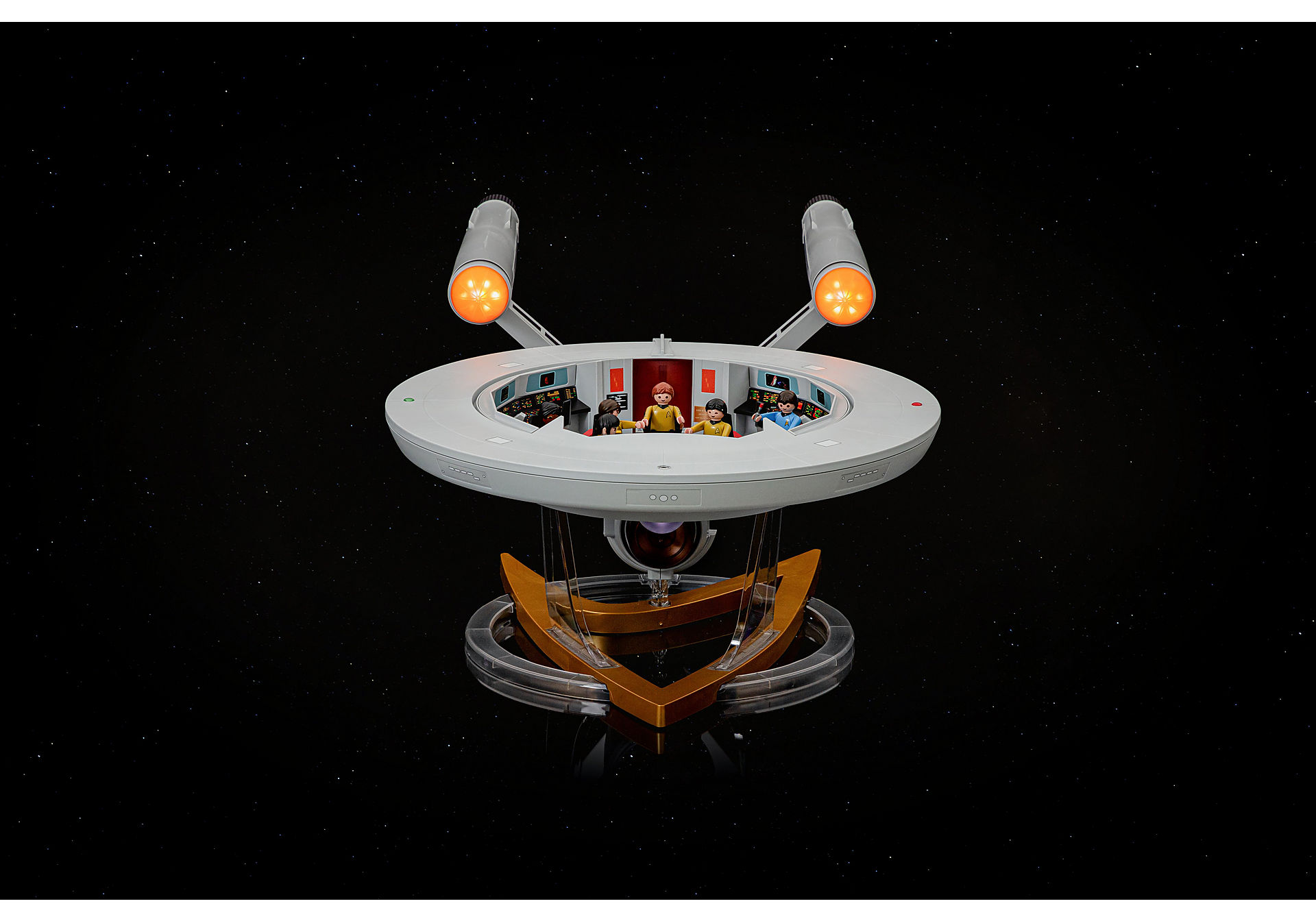 Wer kennt es nicht das legendäre Raumschiff Enterprise? Der Weltraum, unendliche Weiten - Im Jahr 2200 begeben sich Captain James T. Kirk und seine Crew auf ihre Reise in fremde Galaxien. Fünf Jahre lang ist die Enterprise unterwegs, um viele Lichtjahre entfernt von der Erde, unbekannte Welten zu erforschen, neue Lebensformen und Zivilisationen zu entdecken und dringt dabei in Galaxien vor, die nie ein Mensch zuvor gesehen hat. Jetzt gibt es das legendäre Raumschiff U.S.S. Enterprise NCC-1701 in der PLAYMOBIL-Version als exklusives Sammlerstück. Natürlich mit dabei ist die berühmte Besatzung mit Captain Kirk, Chekov, Dr. McCoy, Scotty, Sulu, Uhura und Spock in Sternenflottenuniform. Die PLAYMOBIL-Enterprise besitzt eine Brücke mit drehbarem Sessel für Captain Kirk, Arbeitsplätzen für alle Crewmitglieder, Handyhalterung und Aufbewahrungsfach für Phaser, Communicator und weitere Ausrüstung. Im Rumpf befindet sich der Maschinenraum mit zwei Steharbeitsplätzen. Zur Aktivierung der Licht- und Soundelektronik muss der Dilithiumkern in den Behälter eingesetzt und im Maschinenraum angebracht werden. Die Stromversorgung ist über Batterien oder USB-Anschluss möglich. Beim Einschalten meldet sich Captain Kirk persönlich mit Grußworten. Über die Taster der Mittelkonsole auf der Brücke können verschiedene Licht- und Toneffekte gesteuert werden wie der Warpantrieb, Torpedo- oder Alarmgeräusche. Das Spielfigurenset enthält Captain Kirk, Spock, Uhura, Dr. McCoy, Sulu, Scotty, Chekov und viele weitere Accessoires sowie eine Displayhalterung und ein Kabel zum Aufhängen der Enterprise an der Decke.