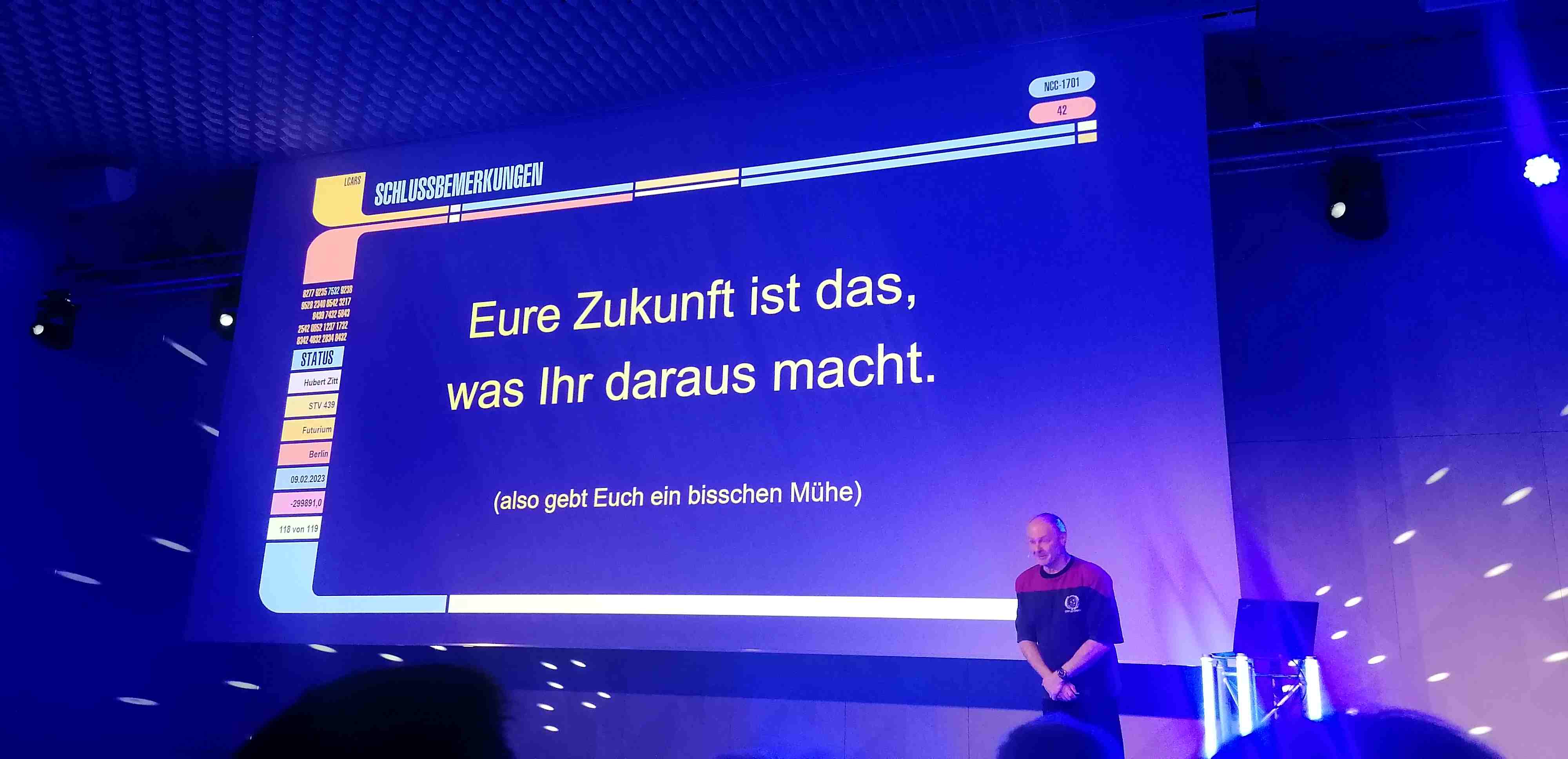Wiedereinmal ein hochinteressanter Vortrag und es lohnt sich immer wieder, Hubert Zitt egal ob zu seiner StarTrek Vorlesung die einmal im Jahr an seiner UNI in Zweibrücken stattfindet oder auf seinen unzähligen Vorträgen in ganz Deutschland zu besuchen. Infos zu den aktuellen Vorträgen sind auf der Homepage https://www.startrekvorlesung.de/ oder klickt einfach auf das Abschlußbild mit dem auch dieser Vortrag beendet wurde - welches wir sehr sehr passend finden!!